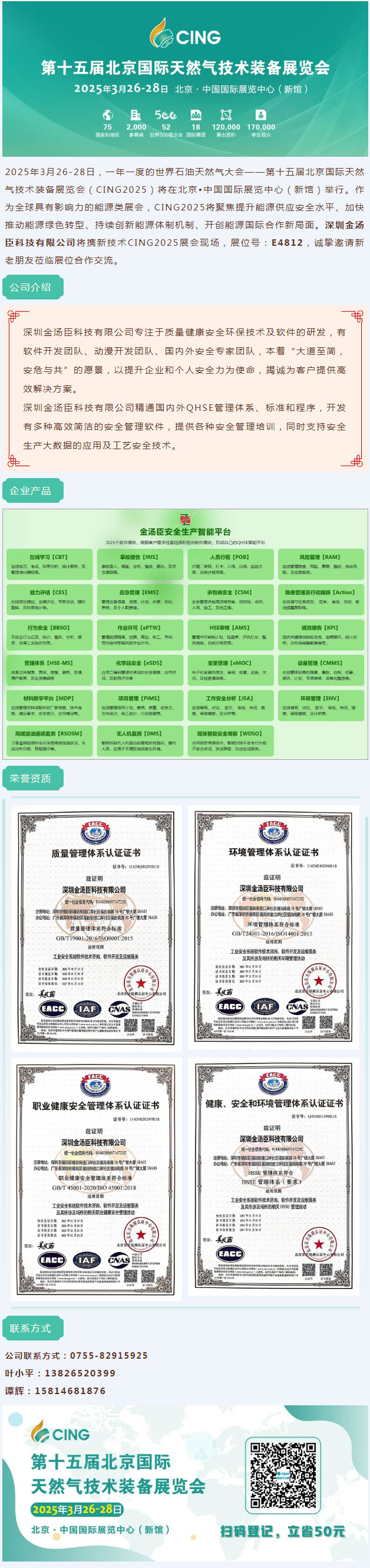 2025-03-032025年3月26-28日,一年一度的世界石油天然气大会——第十五届北京国际天然气技术装备展览会(CING2025)将在北京?中国国际展览中心(新馆)举行。作为全球具有影响力的能源类展会,CING2025将聚焦提升能源供应安全水平、加快推动能源绿色转型、持续创新能源体制机制、开创能源国际合作新局面。深圳金汤臣科技有限公.........【详情】
