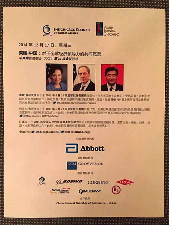 12月16日至18日,第25届中美商贸联委会会议在美国芝加哥举行,中国国务院副总理汪洋与美国商务部长普利兹克、贸易代表弗罗曼共同主持会议。