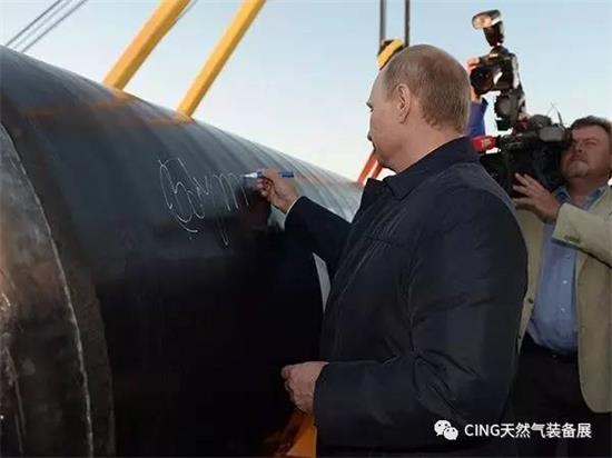 资料图:俄总统普京在输往中国的天然气管道上题字