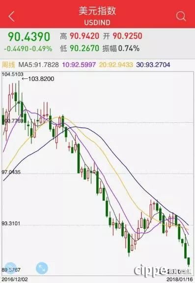 从2017年1月1日起,美元指数开始了漫漫下跌之旅,从高点103.78下跌至目前的90.29,跌幅达13%。