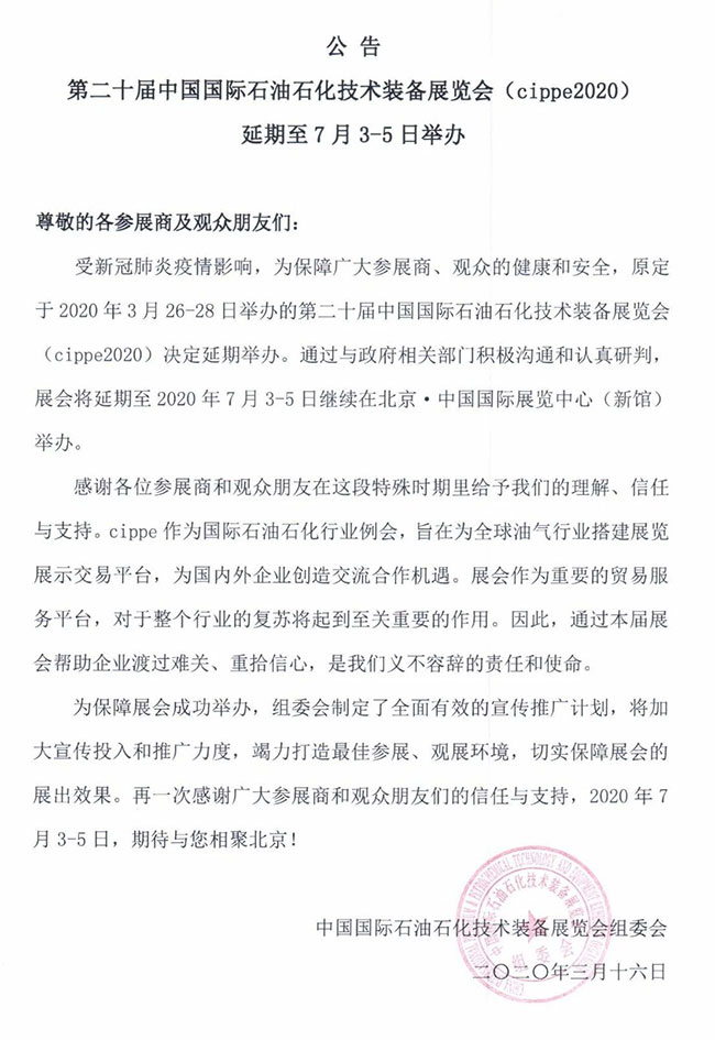 受新冠肺炎疫情影响,原定于2020年3月26-28日举办的第十届北京国际天然气技术装备展览会(CING2020),将延期至7月3日至5日在北京·中国国际展览中心(新馆)举行,欢迎您届时参展参观。同期举办的第二十届中国国际石油石化技术装备展览会也将延期至7月3日-5日。公告内容如下: