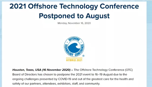 2021年美国石油展OTC推迟至21年8月,具体举办日期尚未确定。