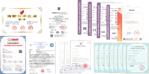 公司先后通过了ISO9001质量管理体系、ISO14001环境管理体系和GBT28001职业健康安全管理体系,产品通过了CE、FCC、RoHS、A-tick、RCM、ATEX、CNEX、EMC等国内外产品权威认证。